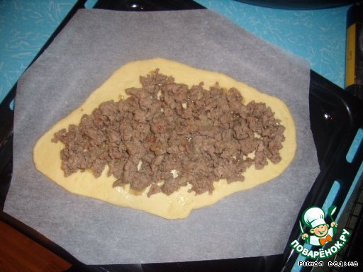 • Выкладываем на тесто обжаренный с луком куриный фарш.