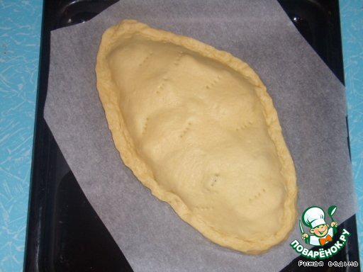 • Раскатываем 2 часть теста, накрываем им начинку, защипываем края, покалываем вилкой в нескольких местах.
