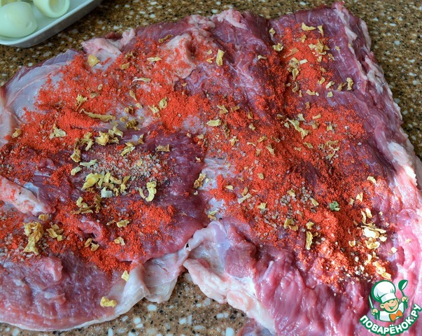 Пласт пашины разложить, посыпать солью, паприкой и сушёным луком.