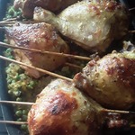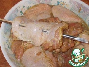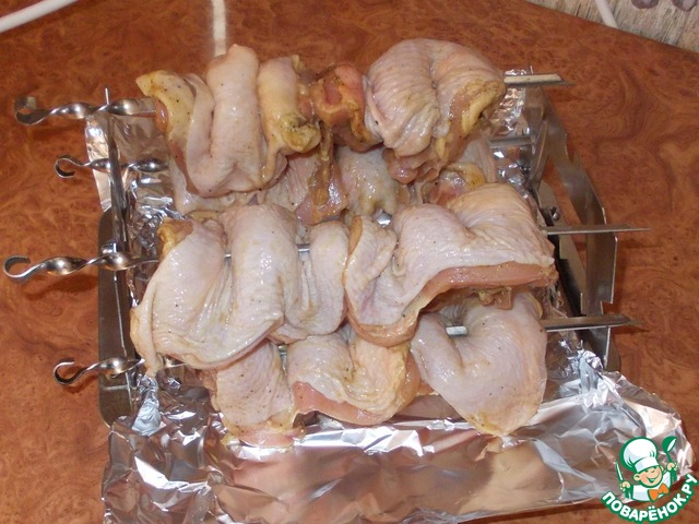 По прошествии времени нанизываем бедрышки на шампуры методом штопки.