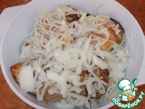 Готовые бедра снимаем с шампуров и выкладываем в керамическую посуду слоями с маринованным луком. (Ссылку на рецепт маринованного лука приложу в конце рецепта). Накрываем крышкой и даем постоять минут 20-30.