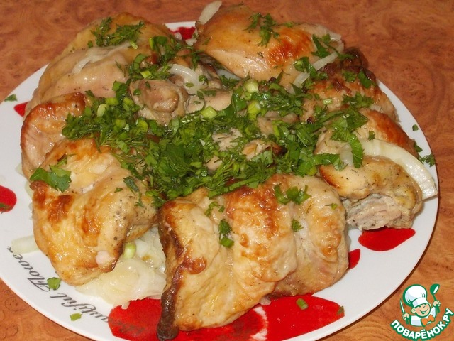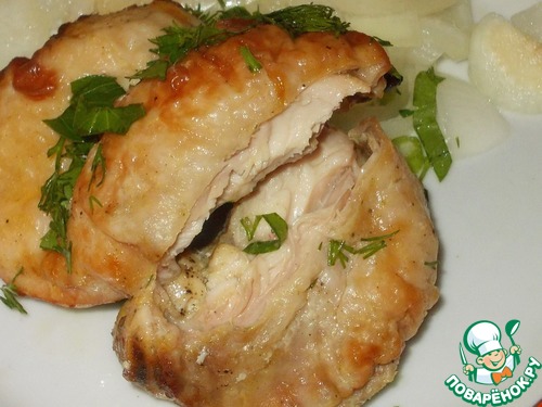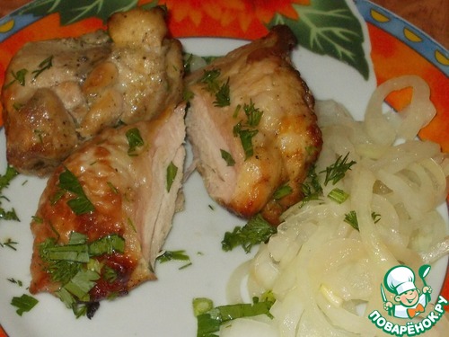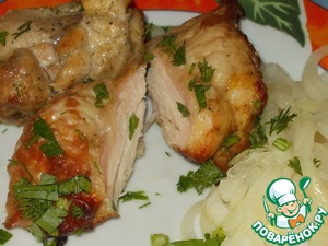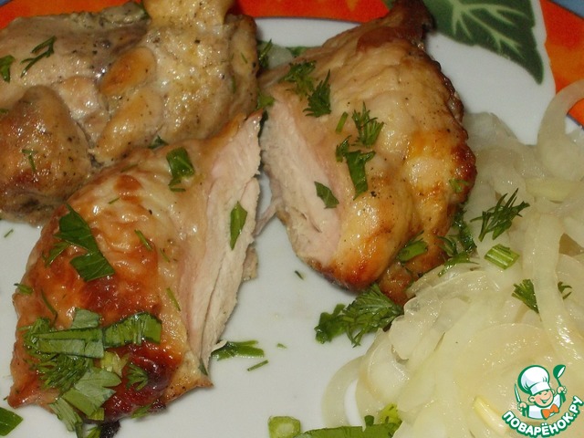 Получилось очень вкусно, отлично промариновалось (2 часа), нежная и главное сочная грудка вышла, ну а уж в сочетании с луком - объедение. Обязательно повторю с бёдрами, представляю сколько там "сока".
