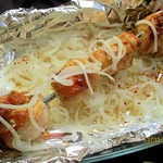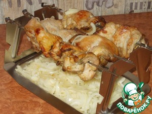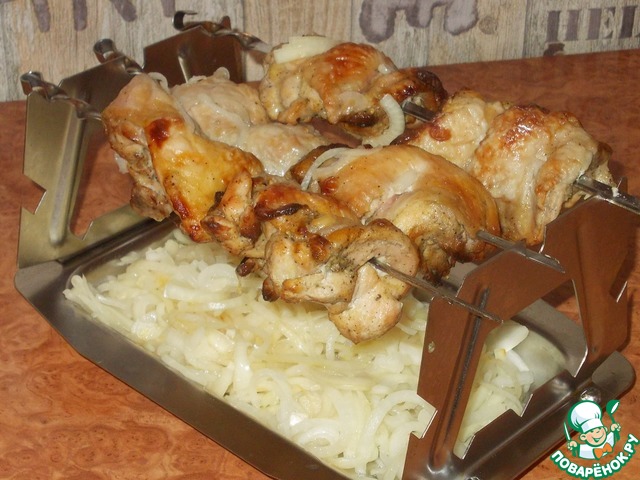 Бедра возвращаем на шампуры, маринованный лук выкладываем в поддон. -