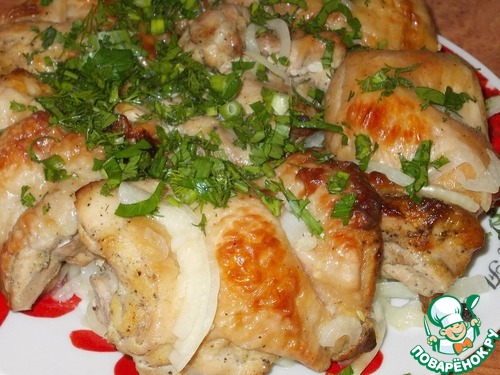 Готовые бедрышки извлекаем из духовки. При протыкании мяса должен вытекать прозрачный сок без примеси крови.