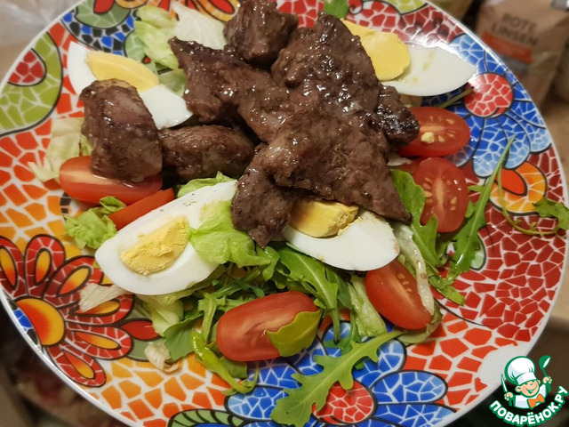 Салат с куриной печенью, заправленный кисло-сладким соусом