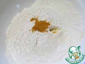 Затем добавляем 3 стакана муки и 1 ч. л куркумы, перемешиваем.