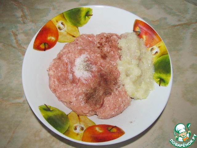 Лук пропускаем через мясорубку и добавляем в фарш. Солим и перчим по вкусу, перемешиваем. -
