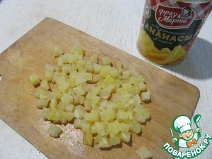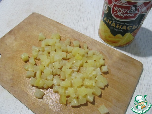 Открываем баночку ананасов ТМ Фрау Марта. Полбаночки ананасов порежем на небольшие кусочки.
