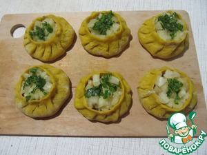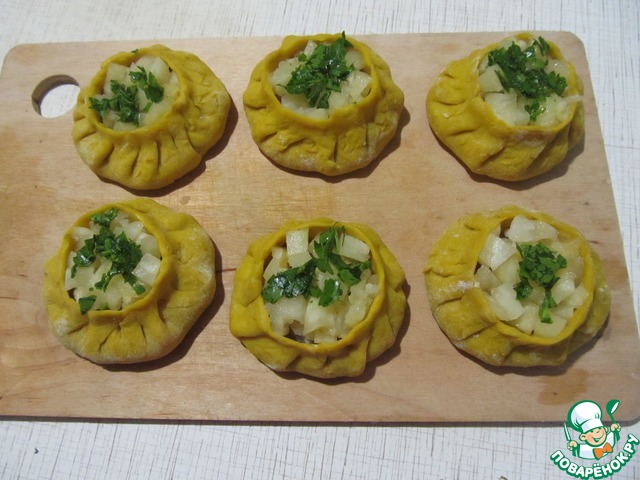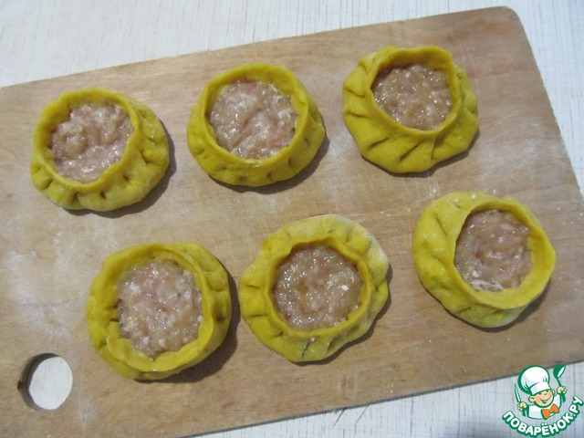 Слепим манты с куриным фаршем, оставляя открытым верх.