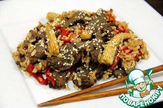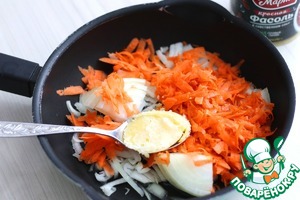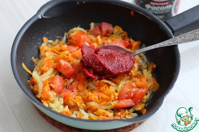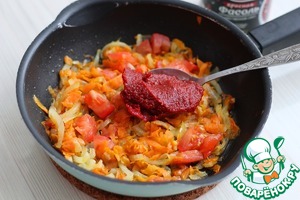 Пассеровать лук и морковь до легкой золотистой корочки. С помидора (1 шт) снять шкурку, обдав его кипятком. Нарезать помидор кубиками/кусочками. Далее в сковороду добавить 1 ст. ложку с горкой томатной пасты, добавить 2-3 ст. ложки бульона, добавить сахар (1 ч. ложку), добавить пряности (1 ч. ложку), добавить красный жгучий перец, добавить черный молотый перец по вкусу. Пряно-овощную смесь протушить на медленном огне в течение нескольких минут. Обычно на это требуется 5-7 мин.