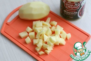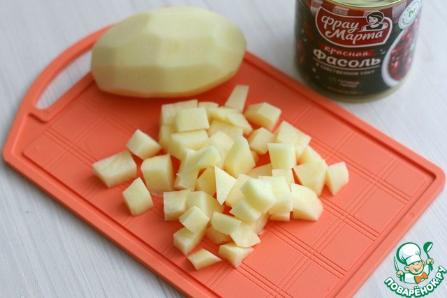 Картофель (2 шт.) нарезать на кубики. Добавить картофель в бульон, где ранее отваривалось мясо. Огонь убавить и варить картофель до состояния Al dente. -