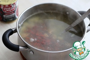 В кастрюлю добавить 2,5 литра воды, добавить говядину (350 гр.) на косточке, Довести бульон до кипения, снять пенку, добавить соль по вкусу, варить мясо до готовности. Затем мясо вынуть из кастрюли, удалить косточки, нарезать на кусочки, отставить в сторону.