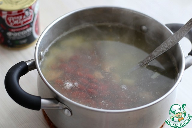 Добавить фасоль в бульон с картофелем. Далее добавить нарезанное мясо, готовую тушеную овощную смесь - зажарку, добавить лавровый лист (1 шт.), отрегулировать по вкусу соль и варить суп до полной готовности картофеля. Далее суп снять с огня, дать настояться 10-15 мин.