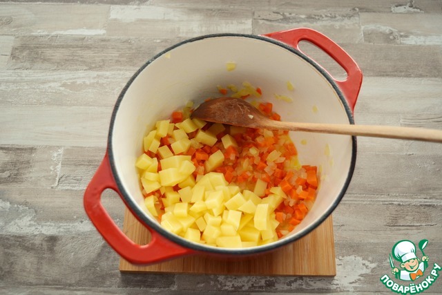 Добавьте нарезанный кубиком картофель и также слегка поджарьте всё вместе