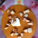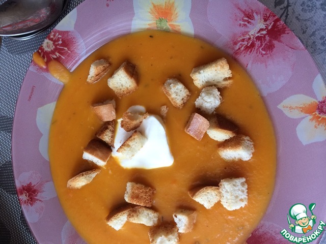 Сейчас суп достигнет баланса трех вкусов. Сладкого за счет моркови, соленого за счет добавленной соли, и кислого за счет сметаны. На литр супа я добавил примерно 100 граммов. Для облегченной версии такого супа, вполне подойдет и несладкий йогурт.