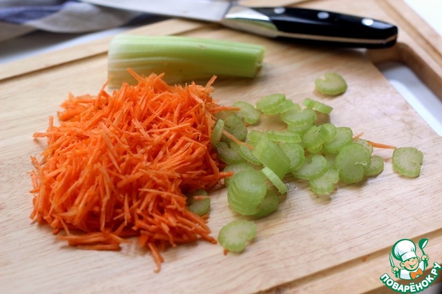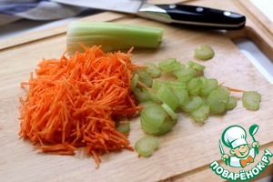 Пока обжаривается лук, натереть морковь, нарезать сельдерей и добавить к зажарке.