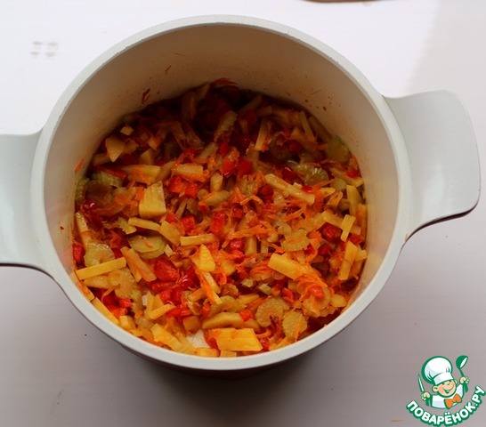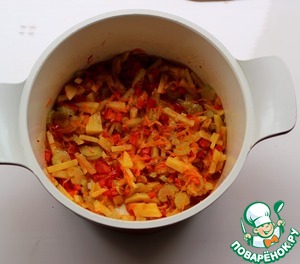 Обжаренные овощи залить горячим бульоном или водой и варить до готовности картофеля.