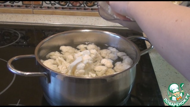 Кипящую воду подсолить, отправить туда помытую и нарезанную на соцветия цветную капусту. Если вы хотите, чтобы капуста была хрустящей, варите 5 минут, для того, чтобы была мягкой, варите 10 минут. Отваренную капусту откинуть на дуршлаг.