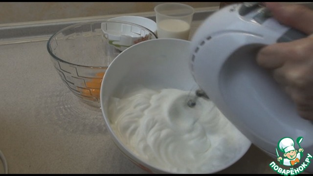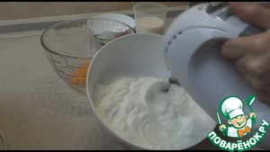Берем яйца, отделяем белки от желтков. К белкам добавляем щепотку соли и взбиваем до пышных пиков. Отставляем в сторону.