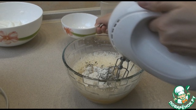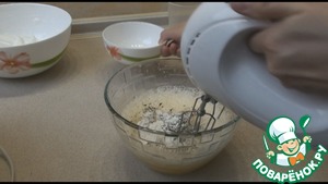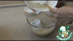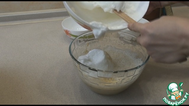 Всыпаем натертый сыр, размешаем. Добавляем понемногу взбитые белки и размешиваем лопаткой снизу вверх, постепенно вмешиваем все белки.