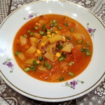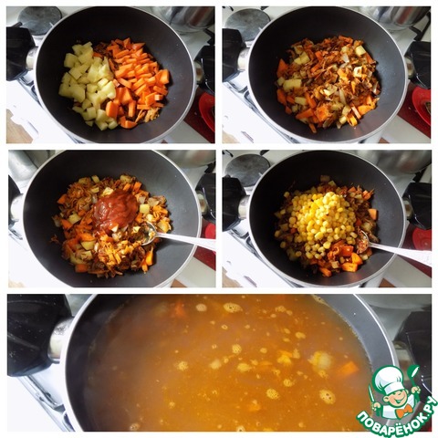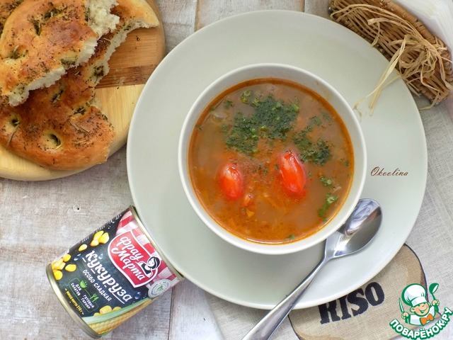 Далее - очередь картофеля и моркови, порезанных небольшим кубиком. Перемешиваем и опять под крышкой на минимальном огне тушим 10 минут. Кладём томатную пасту, соединяем и выкладываем кукурузу из банки. Тушим ещё минут 5. Заливаем содержимое кастрюли кипятком, перемешиваем, доводим до кипения и варим суп под крышкой до готовности риса. Красный рис варится подольше обыкновенного. Солим по вкусу.