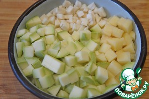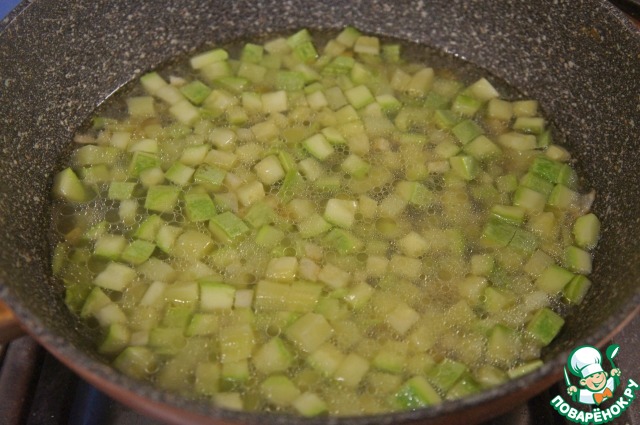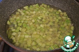 Лук-порей нарезать колечками и тщательно промыть в дуршлаге под проточной водой, чтобы вымыть весь песок и землю, которые могут прятаться между листьями. Сельдерей, кабачок и картофель вымыть и очистить. Если кабачок молоденький, можно его не очищать. Нарезать некрупными кубиками.
