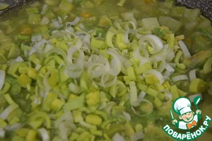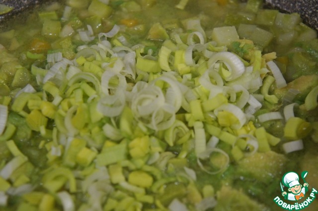 Всыпать лук-порей и протушить еще 2-3 минуты.