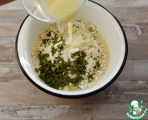 В муку добавьте сушеную зелень (укроп, петрушка, зеленый лук), влейте сюда взбитое яйцо.