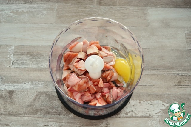 Для рыбных кнелей, в чашу блендера положите филе горбуши, добавьте сырое яйцо и измельчите.