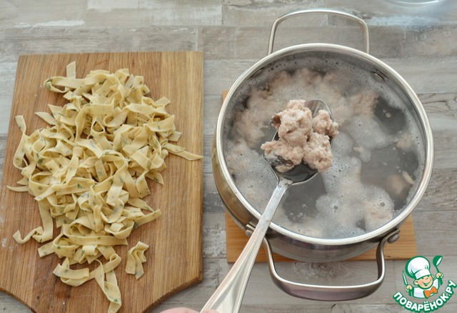 Как только кнели всплывут, добавьте лапшу и доведите до кипения, варите около 5 минут