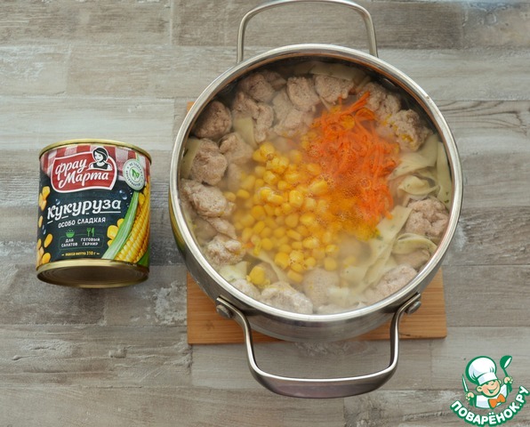 Добавьте в суп кукурузу ТМ "Фрау Марта" вместе с жидкостью, соль по вкусу, доведите до кипения и снимите с огня.