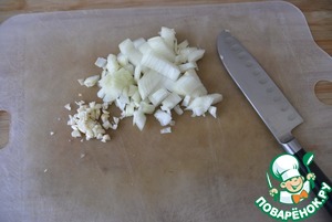 Лук и чеснок чистим, измельчаем, обжариваем на растительном масле до лёгкого аромата.