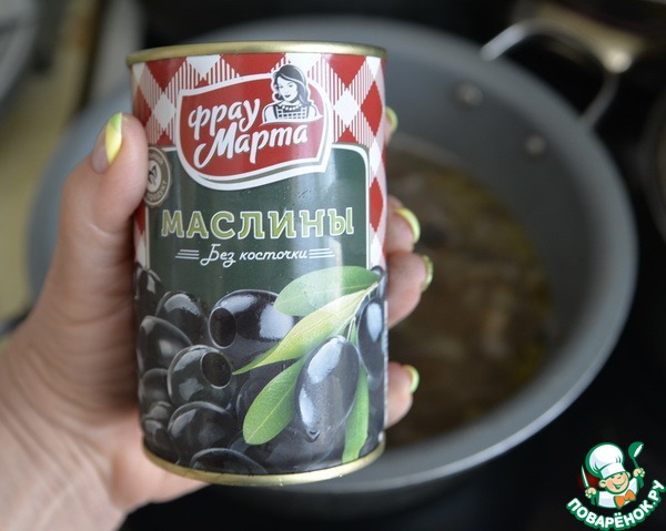 За 5 минут до готовности берём маслины без косточек, у меня от "Фрау Марта".