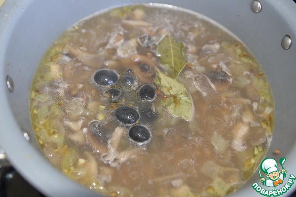 Кладём в суп маслины, также одновременно кладём соль, смесь перцев, лавровый лист.