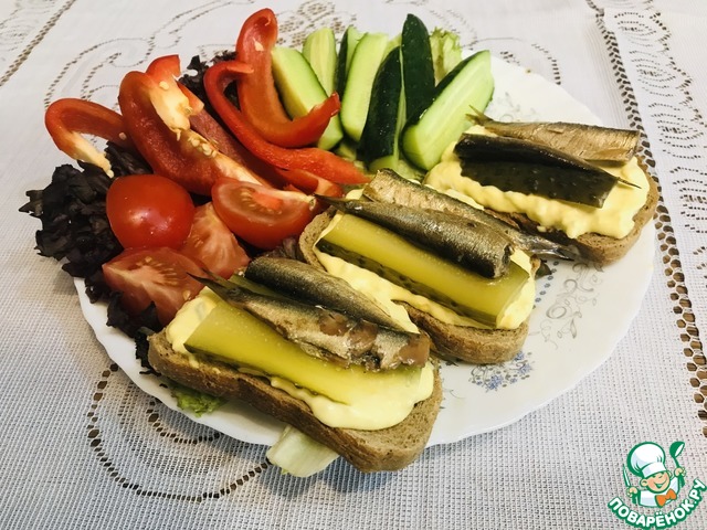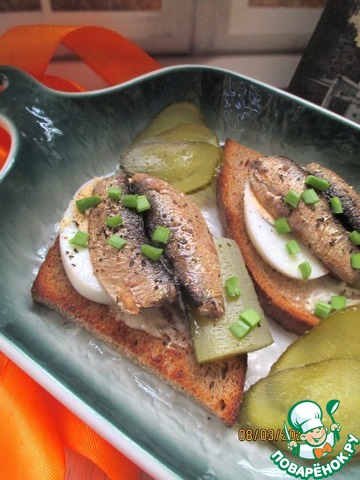 Вариантов такого бутерброда на сайте много. Предлагаю вам вариацию еще одного: закусочный бутерброд со шпротами, маринованным огурцом на яично-чесночной намазке. Бутерброды по этому рецепту получаются красивыми и очень вкусными. Приготовьте такие бутерброды и они вам понравятся!