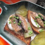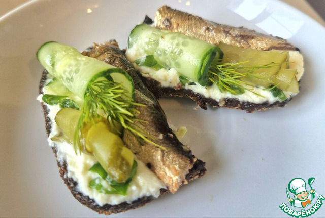 3. Намазать хлеб намазкой, сверху положить шпроту и половинку маринованного огурца. Посыпать нарезанным зеленым луком.
