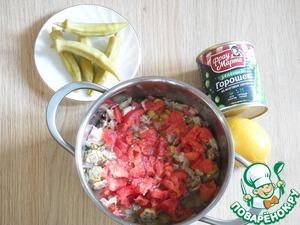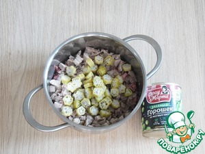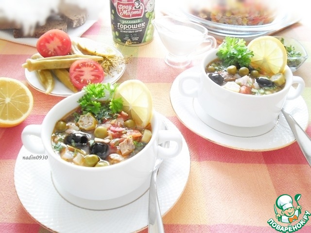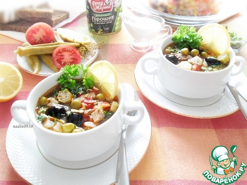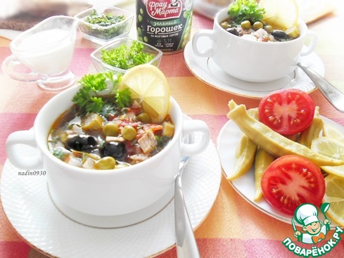 Для "густоты вкусовых ощущений" добавим ещё и зеленый горошек, в некоторых солянках даже картошка бывает, чем же горошек хуже? Да ещё и от проверенного производителя - ТМ Фрау Марта! -