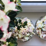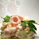 Описание: Салат Неженка с ветчиной -предлагаю Вам еще один простой салат, который подойдет, как для праздничного стола, так и для повседневного семейного меню. Минимум времени для приготовления. Салат получается нежный, но пикантный за счет чесночка!