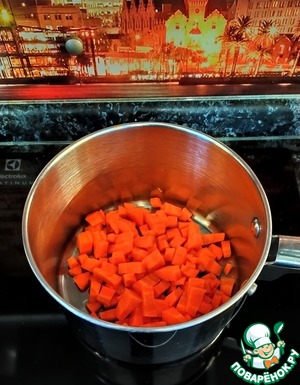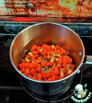 Поставить на плиту кастрюлю на высокую температуру. Влить в нее 2 ст. ложки оливкового масла. Далее всыпать нарезанную кубиками морковь.