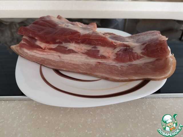 Итак, для начала покупаем 1 килограмм постной свиной грудинки с кожей. Чем меньше сала, тем вкуснее (хотя любители сала могут выбрать жирность на свой вкус, будет в любом случае вкусно!).