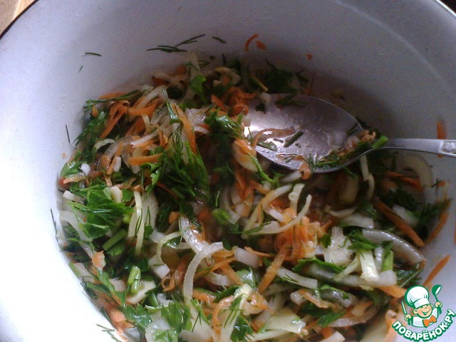 Морковь сырую натираем на крупной терке. Лук репчатый режем на полукольца или четвертькольца. Чеснок режем тонкими пластинками. Зелень петрушки и укропа мелко режем. Если есть базилик, добавим несколько веточек. У меня был сухой, добавила 1ч. л. Все перемешиваем, добавляем маринад: мед, уксус, оливковое масло, снова перемешиваем.
