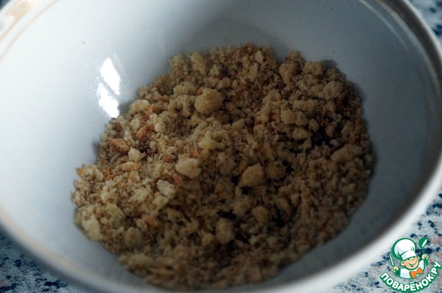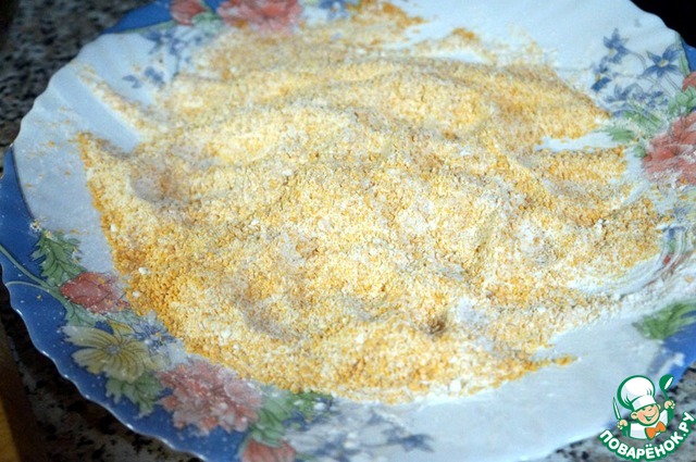 В блюдо насыпать крахмал, панировочные сухари, хорошенько смешать.