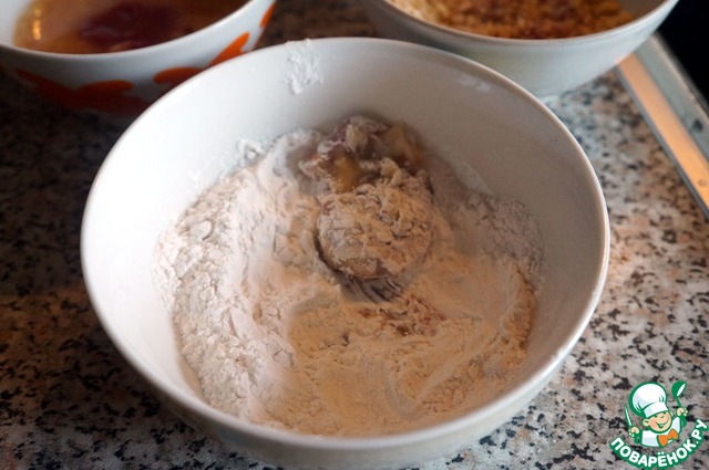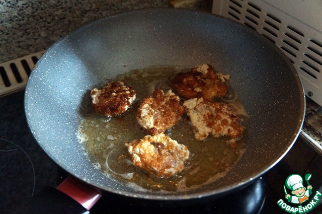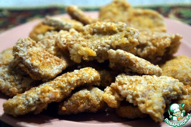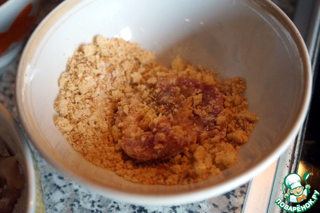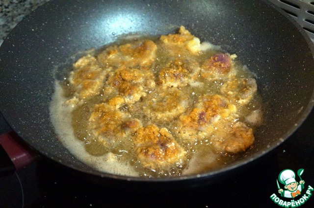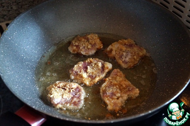 Кусочки мяса окунать в льезон, затем в смесь сухарей и крахмала, жарить до румяной корочки.