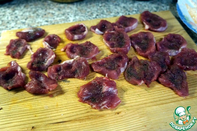 Вырезку нарезать поперек медальонами толщиной 1,5 – 2 см.