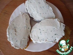 Намажьте поджаренный хлеб толстым слоем козьего сыра (у меня сыр козий со свежей зеленью) и нарежьте на гренки по 2 см каждая.