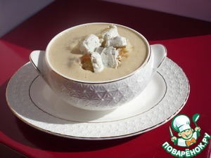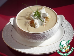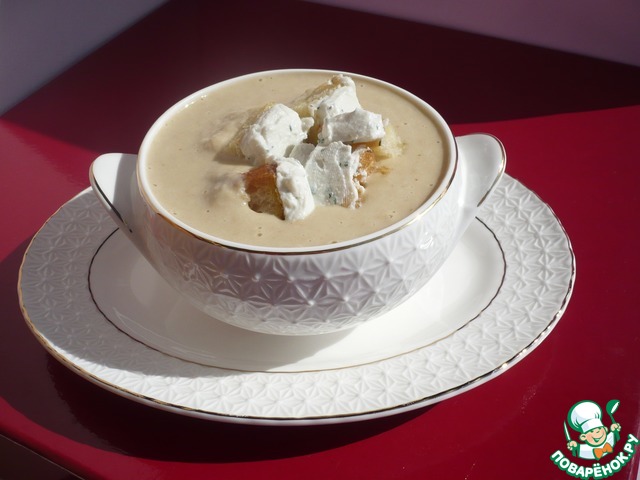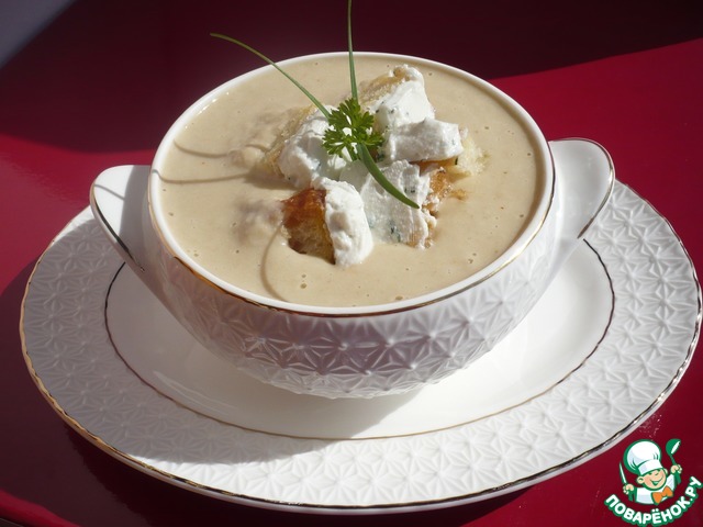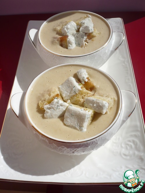 Подавайте суп, разлив в небольшие бульонницы, сверху положите гренки с козьим сыром и посыпьте черным молотым перцем.