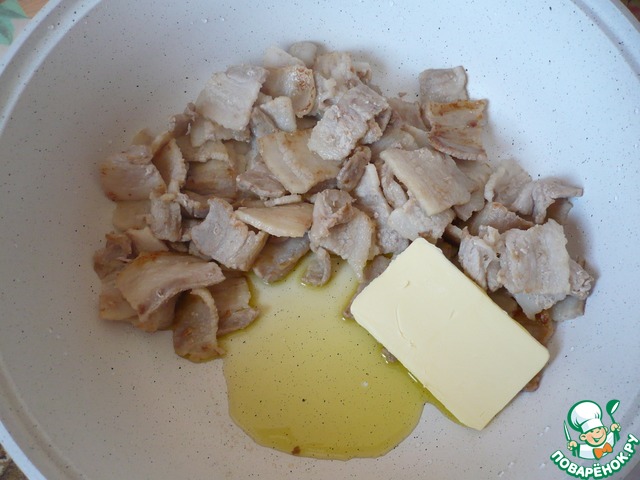 К бекону добавьте оливковое и сливочное масло.