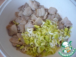 Нарежьте полукольцами лук-шалот и тоже добавьте к бекону, обжарьте 6 минут до мягкого состояния.