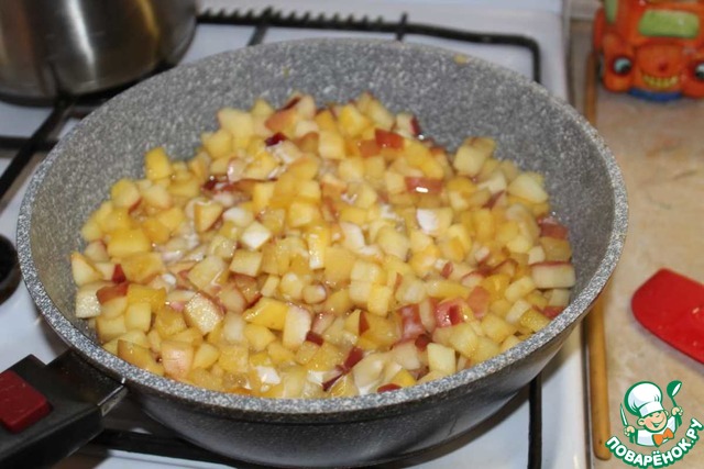 Выкладываем яблоки на сковородку. Добавляем сахар и тушим 5-7 минут.