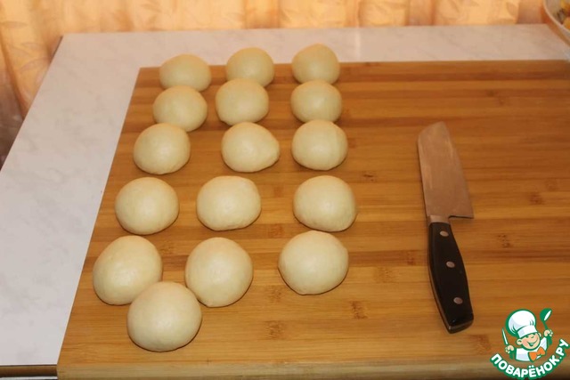 Тесто делим на раные части. У меня получилось 16 частей по 70-75 грамм.